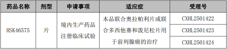 HSK46575片是公司自主研发的一种口服、强效和高选择性的小分子抑制剂,拟用于前列腺癌的治疗,目前正在进行Ⅰ期临床研究。本次获得受理的为本品联合奥拉帕利片或联合多西他赛和泼尼松片用于前列腺癌的治疗适应症的临床试验申请。