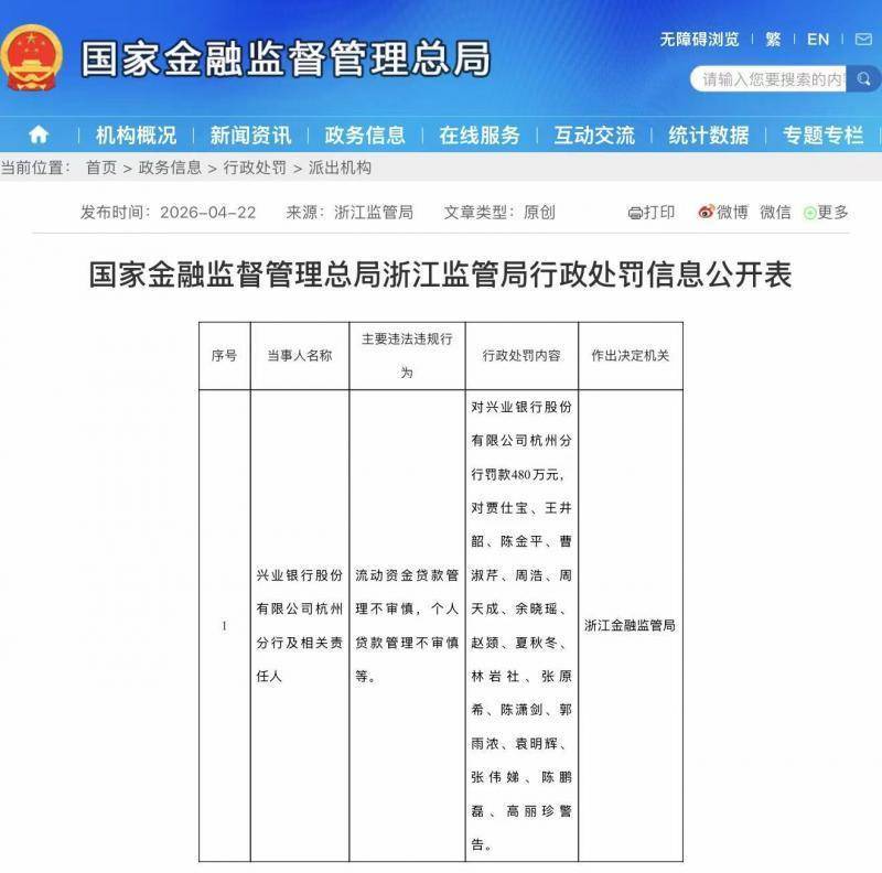 4月22日,国家金融监督管理总局浙江监管局发布的行政处罚信息公开表显示,兴业银行股份有限公司杭州分行(以下简称“兴业银行杭州分行”)因存在流动资金贷款管理不审慎、个人贷款管理不审慎等违法违规行为,被处以480万元罚款,17名相关责任人均受到监管警告处罚。