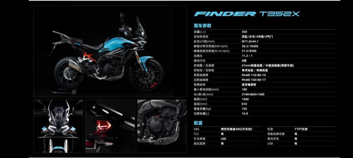 配置上T352X也拥有不错的表现,全车搭载全LED灯具的同时MBP还为其配备一块7寸TFT全彩液晶仪表,并支持手机互联及投屏导航等功能。减震上T352X采用41mm倒立式前减震,中置后减震支持预载可调功能;刹车上则搭载前双活塞卡钳和后单活塞卡钳,标配博士提供的双通道ABS系统和TCS牵引力控制系统。原厂前19后17寸辐条轮毂,配备倍耐力全地形胎。
