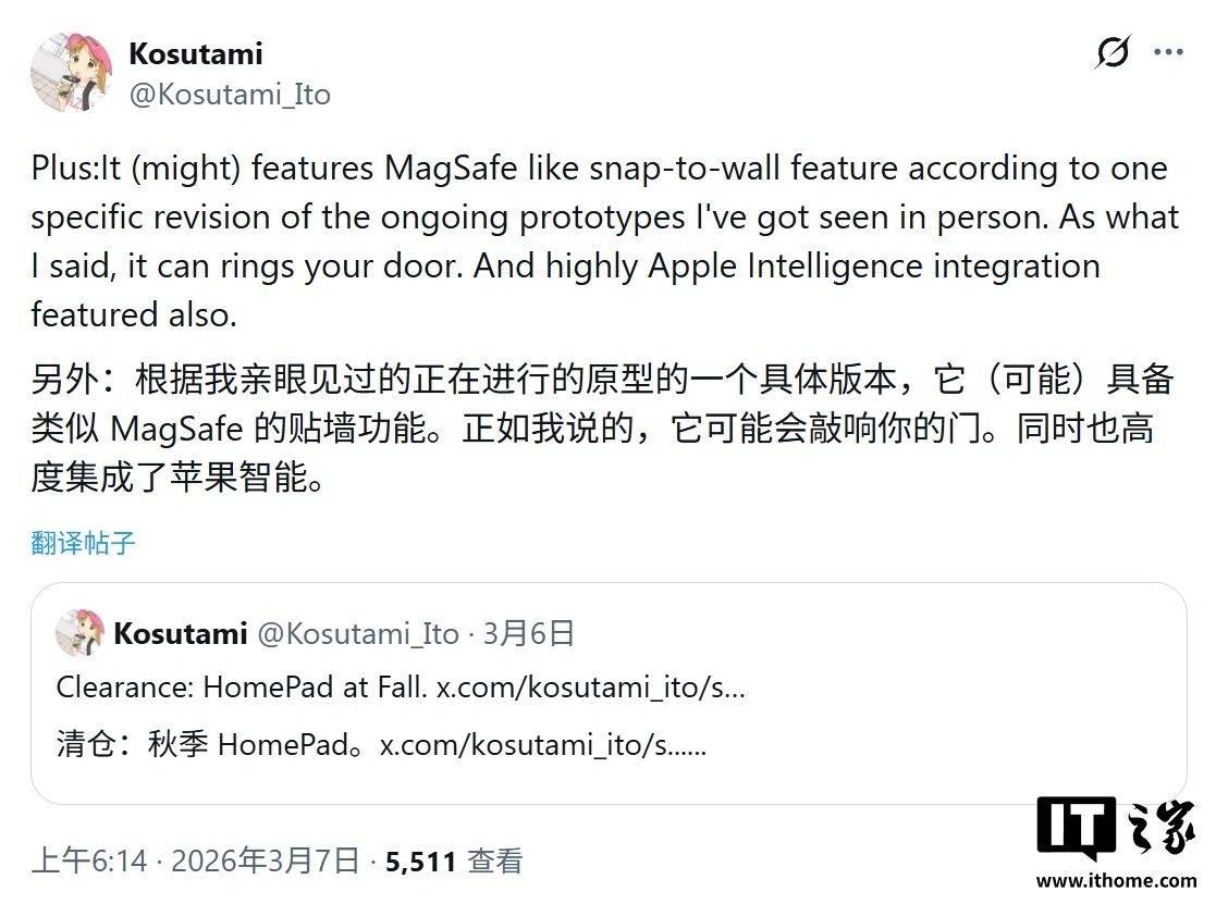 IT之家 3 月 10 日消息,彭博社的马克 · 古尔曼(Mark Gurman)今天(3 月 10 日)发布博文,爆料称苹果公司计划于 2026 年 9 月随 iOS 27 系统,同步推出其首款智能家居显示器(可能叫 HomePad 或者 HomeHub)。