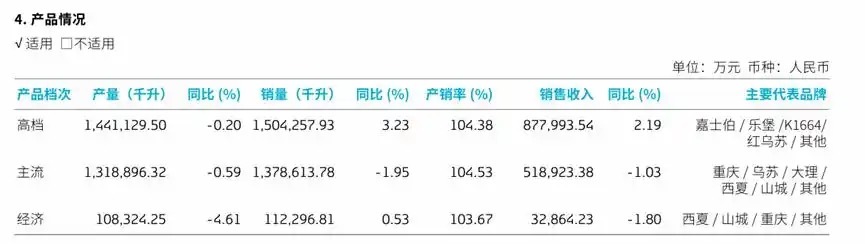 重庆啤酒按价格将产品划分为三大品类,8元及以上为高档品类,代表产品包括嘉士伯、乐堡、K1664、红乌苏等;4元至8元为主流品类,代表产品有重庆、乌苏、大理、西夏等;4元以下为经济品类,核心产品为西夏、山城、重庆等。