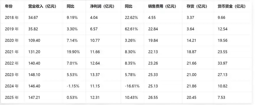 在这些业绩波动背后,成本、库存与资金端均现变化,重庆啤酒的销售费用2018-2025年从4.55亿元增至26.55亿元,八年增长超5倍;存货随也骤升至20亿元左右,高库存仍为经营待解问题;货币资金2018-2022年持续攀升后逐年回落,2025年降至7.53亿元,资金规模收缩明显。