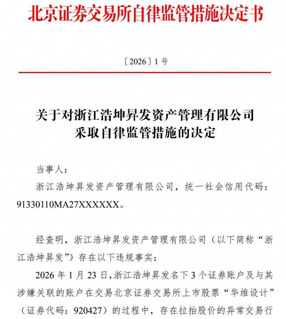 鉴于上述违规事实和情节,根据《北京证券交易所交易规则(试行)》第6.7条,以及《北京证券交易所自律监管措施和纪律处分实施细则》第十七条、第二十条的规定,北交所作出如下决定:对浙江浩坤昇发名下相关证券账户采取限制证券账户交易的自律监管措施,并记入证券期货市场诚信档案。限制证券账户交易期为三个月,自2026年1月26日至2026年4月25日。