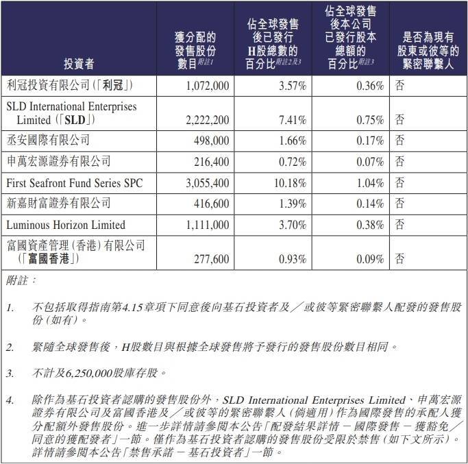 国恩科技本次发行的基石投资者为利冠投资有限公司(「利冠」)、SLD International Enterprises Limited(「SLD」)、丞安国际有限公司、申万宏源证券有限公司、First Seafront Fund Series SPC、新嘉财富证券有限公司、Luminous Horizon Limited、富国资产管理(香港)有限公司(「富国香港」)。