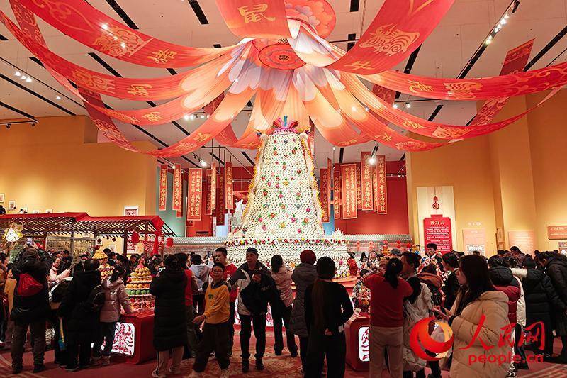 2月19日大年初三,中国非物质文化遗产馆“过年——丙午春节系列主题展”人头攒动,一座高4.5米、直径3.6米的花馍“大鼓枣山”让观众惊叹连连。作品顶部龙凤呈祥昂首腾飞,周身点缀牡丹等数种花卉纹样,呈现出“五谷丰登,百花齐放”的繁荣景象。