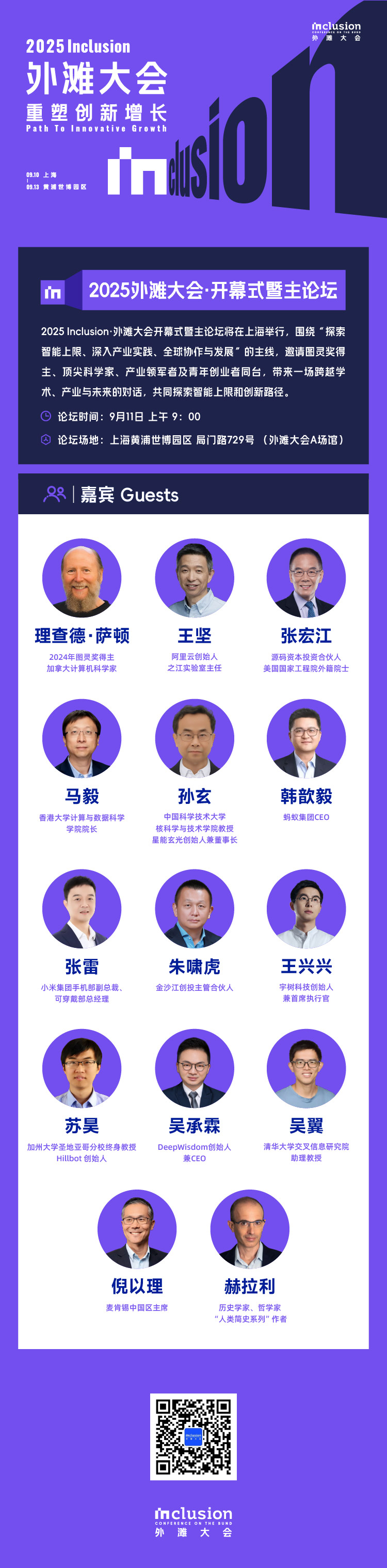2025年9月10日-13日,2025·Inclusion外滩大会将在上海举行,今年大会主题是“重塑创新增长”。9月5日,大会公布主论坛嘉宾阵容,包括新晋图灵奖得主理查德·萨顿(Richard Sutton),阿里云创始人、之江实验室主任王坚,宇树科技创始人兼首席执行官王兴兴、“人类简史系列”作者尤瓦尔·赫拉利(Yuval Noah Harari)等全球顶级学者、产业领袖、青年创业者和科学家,共同探索智能时代的创新路径与商业未来。